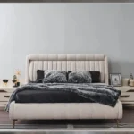 Designed for the lover of clean lines, this simple fabric bed features a wrap-around ribbed texture in a sophisticated slate grey. The integrated matching nightstands and low-profile design create an uninterrupted, zen-like atmosphere in any modern home.