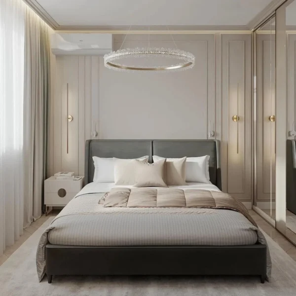 The Sleek Slate bed brings a grounded, masculine elegance to the room. Featuring a split-cushion headboard and a low-profile frame in dark grey velvet, it offers a sophisticated and tailored appearance.