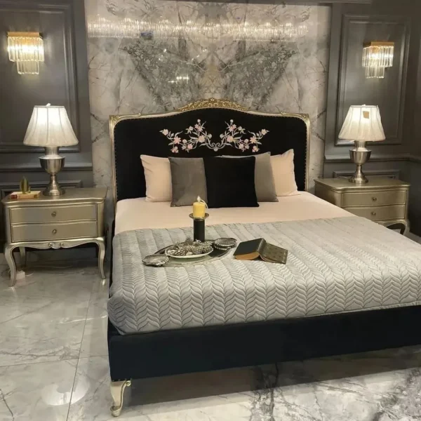 A perfect blend of classic and modern, this black velvet bed features delicate gold floral embroidery on the headboard. The frame is accented with slim gold leaf trim and sits on contemporary tapered silver legs.