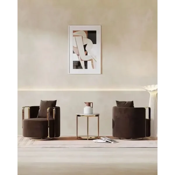 Define luxury with the Sovereign swivel chair. Wrapped in deep brown velvet, it features striking gold deco-finished metal arms that wrap around the frame. The swivel base adds functionality to its opulent, high-fashion appearance.