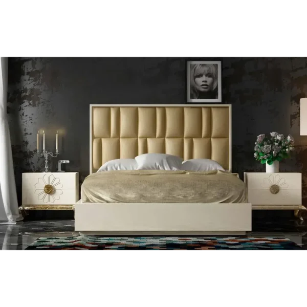 Make a statement with this high-contrast Sovereign bed. The towering headboard features a gold-finished grid pattern set against a clean white frame for a look of pure prestige.