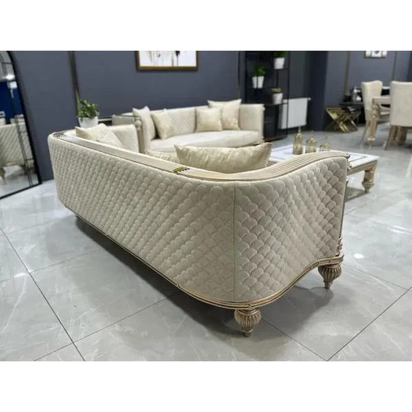 The Sovereign sofa offers a bold, structured look with its grand square arms and quilted white velvet fabric. The silver deco finish provides a cool, metallic contrast that embodies modern luxury living.