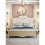 The Sunburst Radiance Bed is a focal point of Turkish design. The towering headboard features radiating fabric panels in crisp white velvet, supported by a sleek frame with refined gold metallic touches.