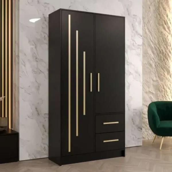 This striking Turkish cupboard stands out with its bold forest green hue and asymmetrical gold striping. Designed for the modern bedroom, it offers a blend of hanging space and exterl drawers for organized, stylish storage.