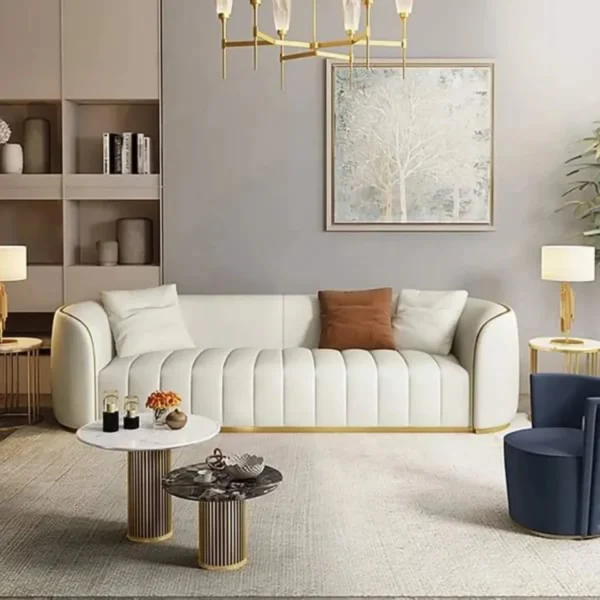 This Turkish-inspired sofa blends beige velvet upholstery with bold gold accents. The vertical fluting and metallic trim provide a high-end look that is both durable and exceptiolly stylish.
