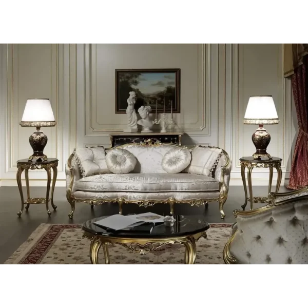 Inspired by French palace aesthetics, this Versailles-style sofa features shimmering silver-grey velvet and a heavily gilded gold frame. The intricate carvings and tufted details offer an unmatched level of luxury.