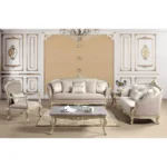 Inspired by French palace aesthetics, this Versailles-style sofa features shimmering silver-grey velvet and a heavily gilded gold frame. The intricate carvings and tufted details offer an unmatched level of luxury.