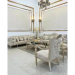 Designed for the Classic home, this sofa features a light brown deco finish that highlights the tural beauty of the wood. The beige velvet and simple, elegant curves create a welcoming and cozy environment.