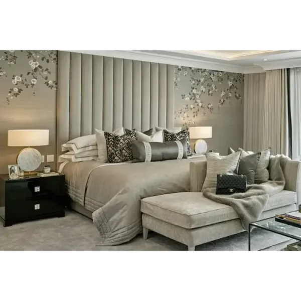 Simple yet sophisticated, the Willow Wall Bed features a tall, vertically fluted headboard in soft grey velvet. Surrounded by subtle floral wall treatments, it offers a serene and comfortable environment without sacrificing high-end style.