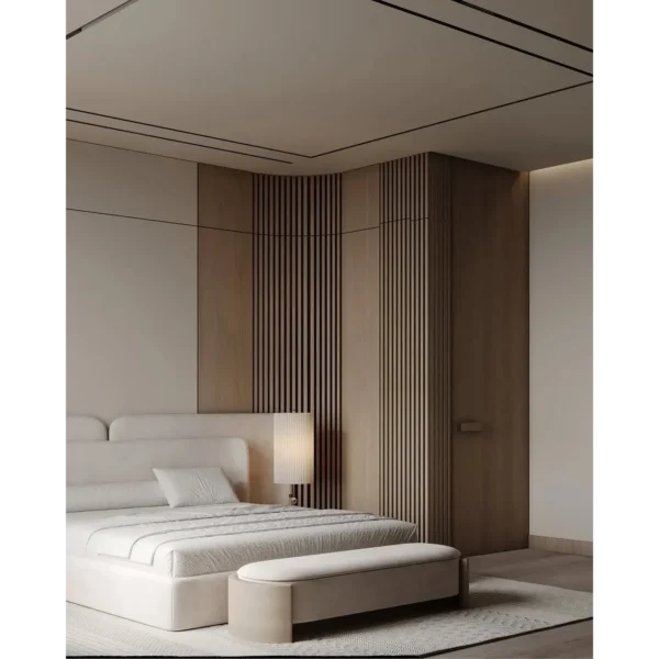 Make a statement with the Zenith Grand. Its oversized, wall-spanning headboard creates a focal point of pure luxury, upholstered in smooth cream velvet for a seamless, architectural look.