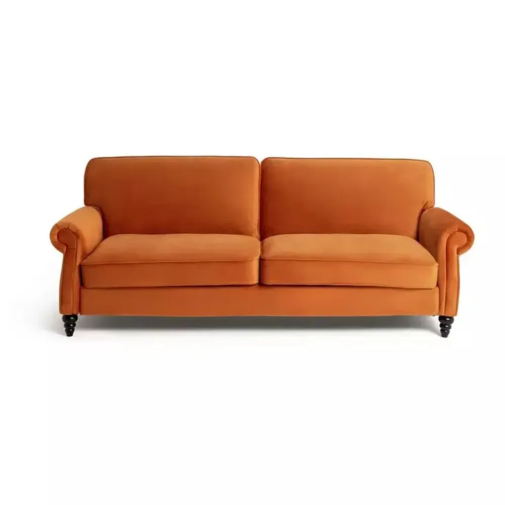 Classic Orange Velvet Three-Seater Sofa with Dark Brown Turned Legs