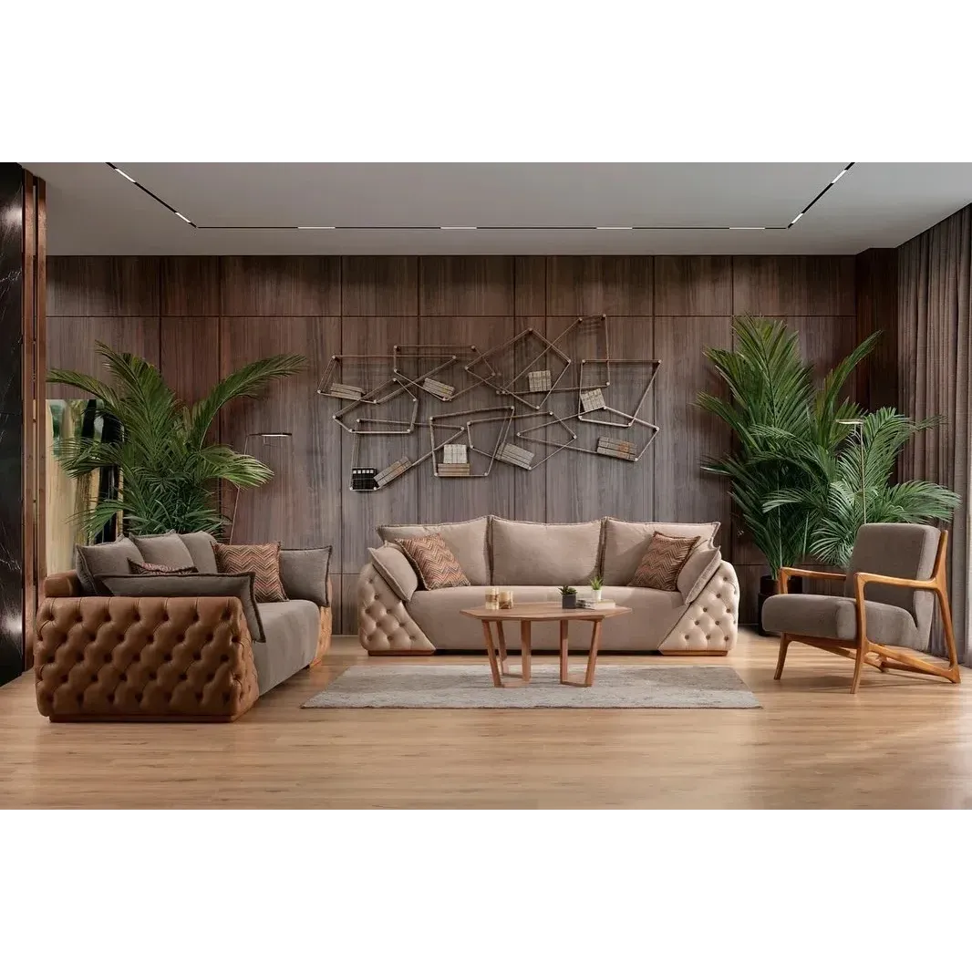 Heritage Haven Tufted Beige Sofa with Walnut Trim