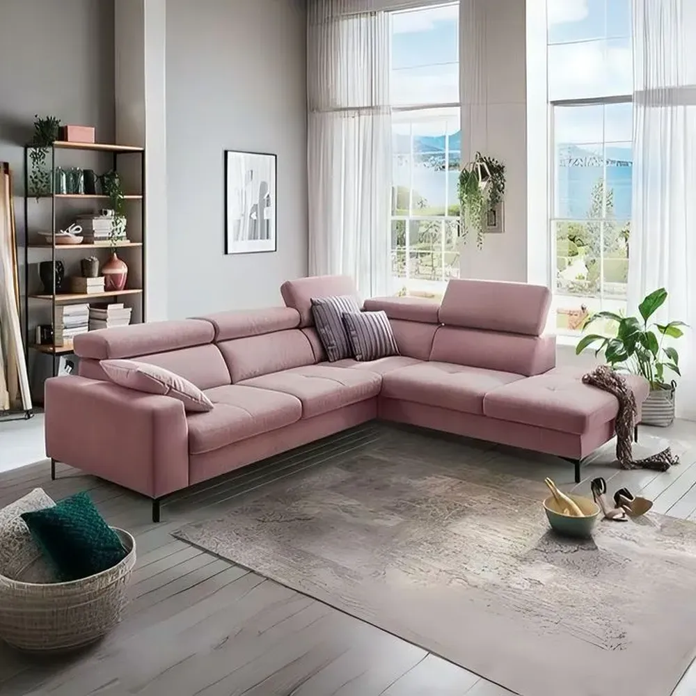 Modern Dusty Pink L-Shaped Sectiol Sofa with Adjustable Headrests – Velvet Upholstery