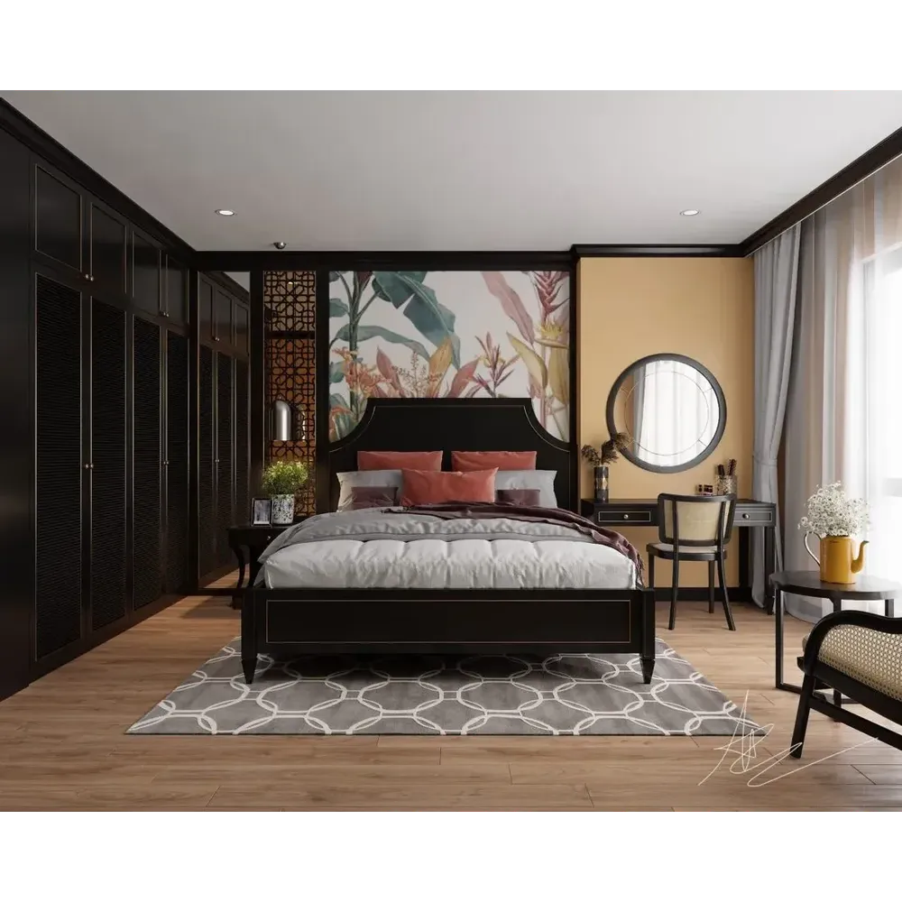 Midnight Ebony Classic Polish Bed with Tropical Backdrop