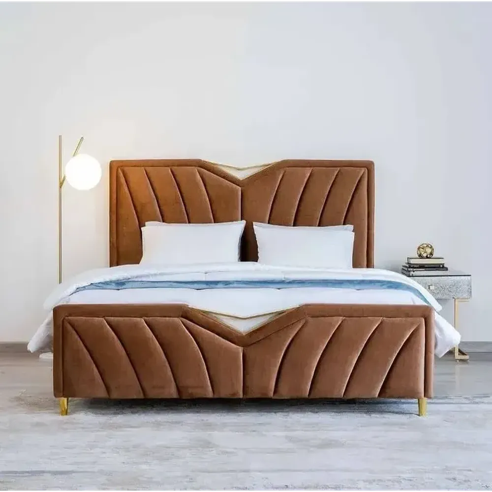 Modern Brown Velvet Wingback Bed with Geometric Blue Accents & Gold Legs