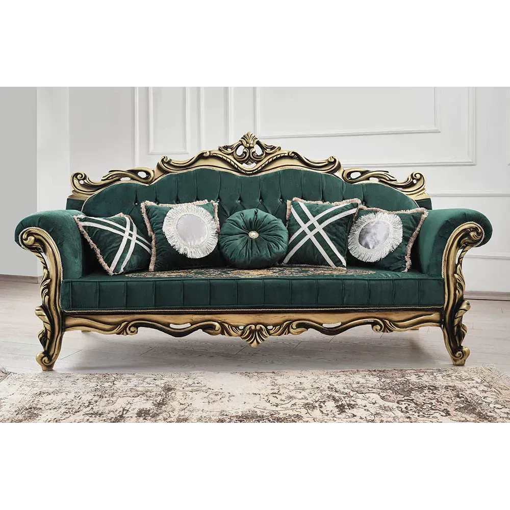 Royal Emerald Green Velvet Sofa with Intricate Gold Carvings