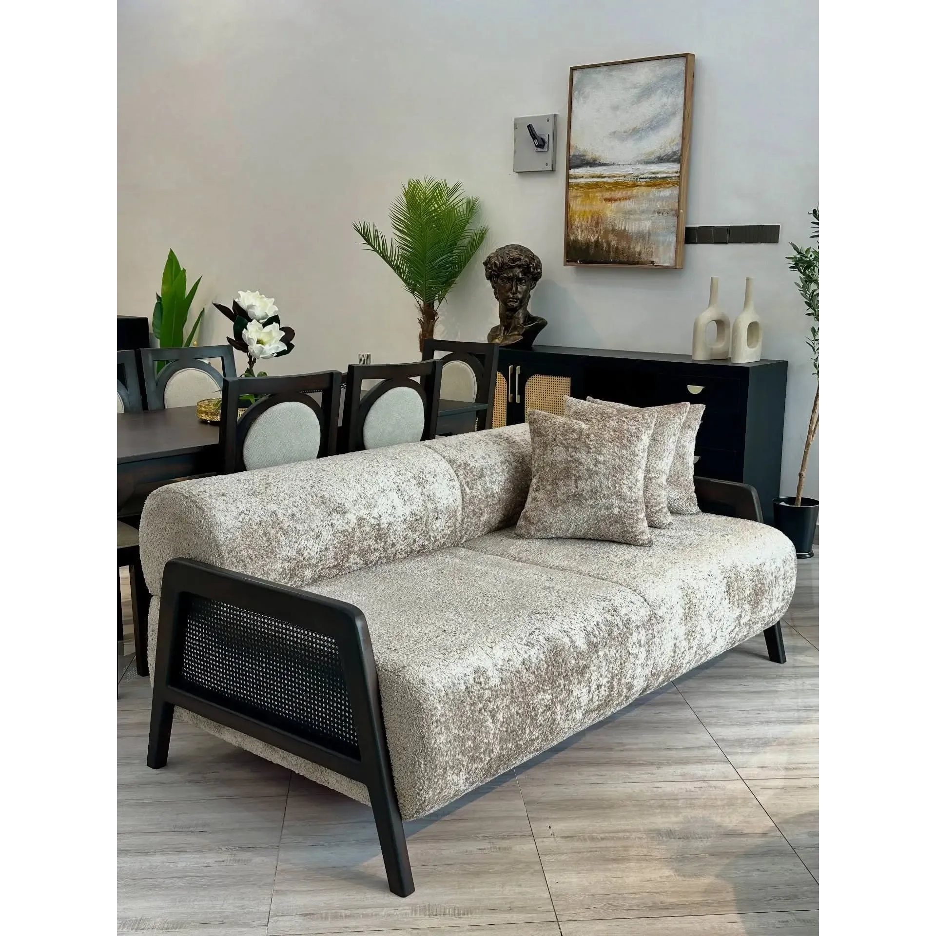 Heritage Haven Tufted Beige Sofa with Walnut Trim