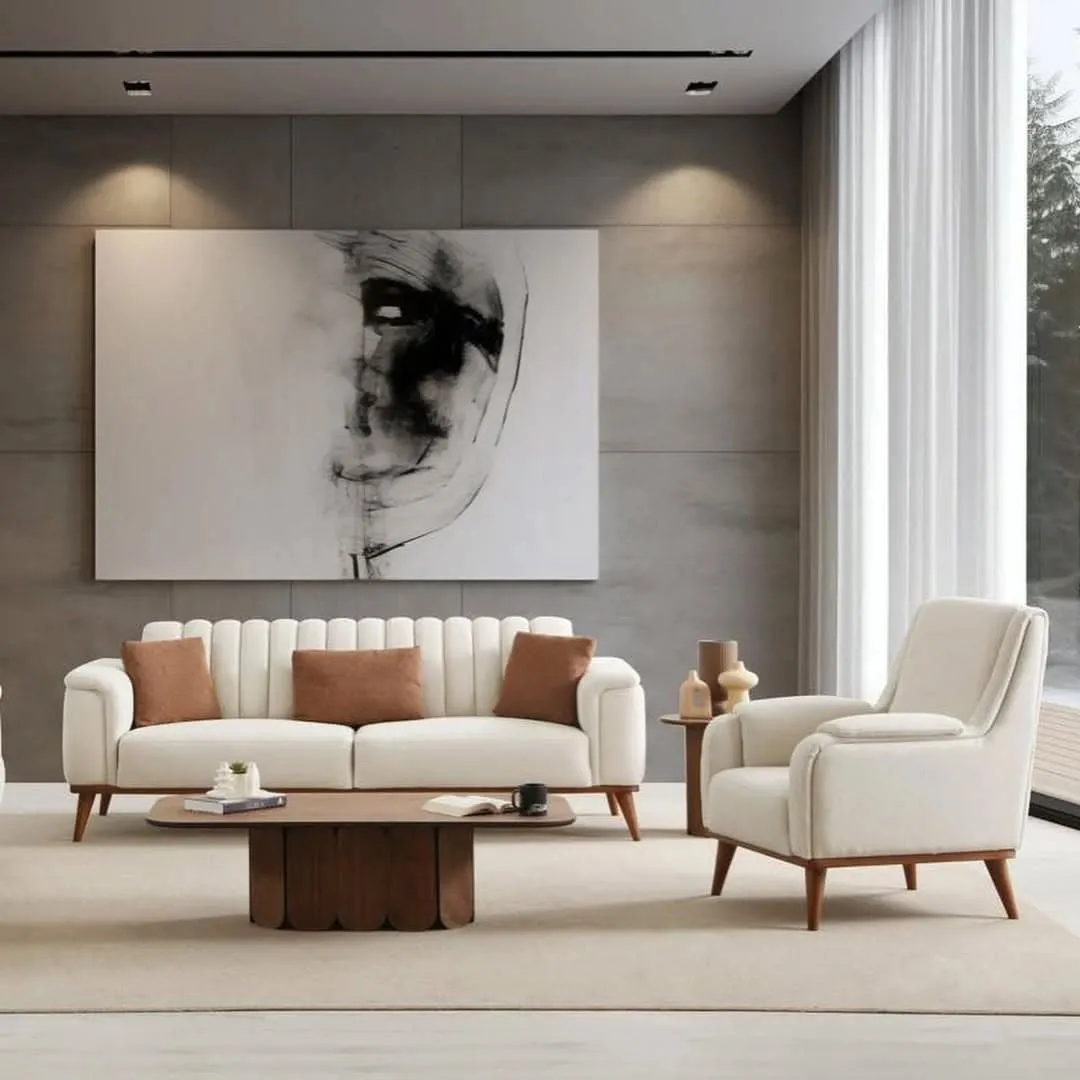 Nordic Zen Ribbed White Sofa with Oak Accents